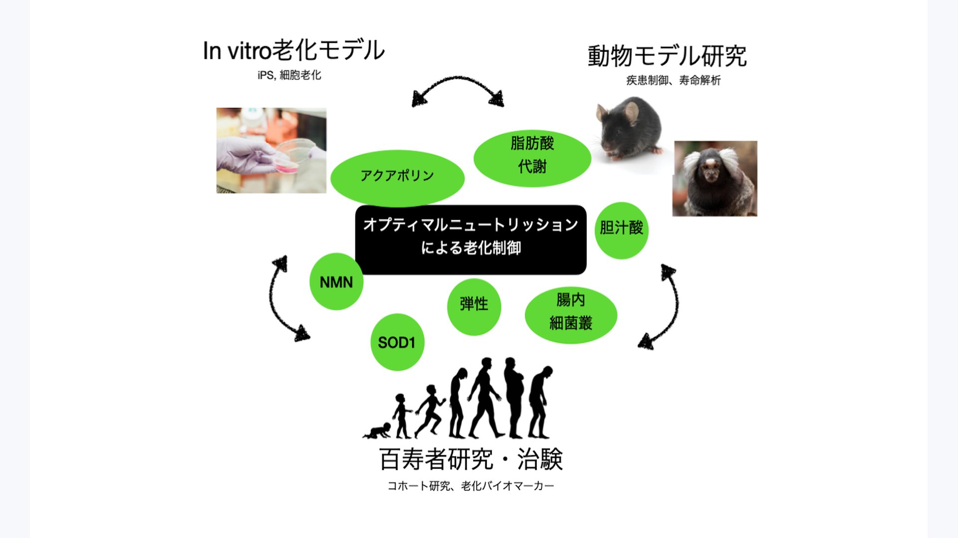 Metabolites and hormones induced by diet regulate gene expression and tissue function during aging. Calorie restriction is a well known intervention to extend lifespan and its downstream molecules such as sirtuins, mTOR and FOXO have a crucial role in the prevention of aging associated diseases including Alzheimer's disease, sarcopenia, type 2 diabetes, cataract and cancer. However, the molecular mechanism underlying how metabolism and diet regulate aging remain unknown. We aim to address the molecular mechanism with a concept of "Optimal Nutrition" in which metabolism regulates cellular and tissue function in gender, circadian rhythm and tissue dependent manners. As an interdisciplinary longevity cluster, the study outcome will be developed into a novel anti-aging drug or intervention.