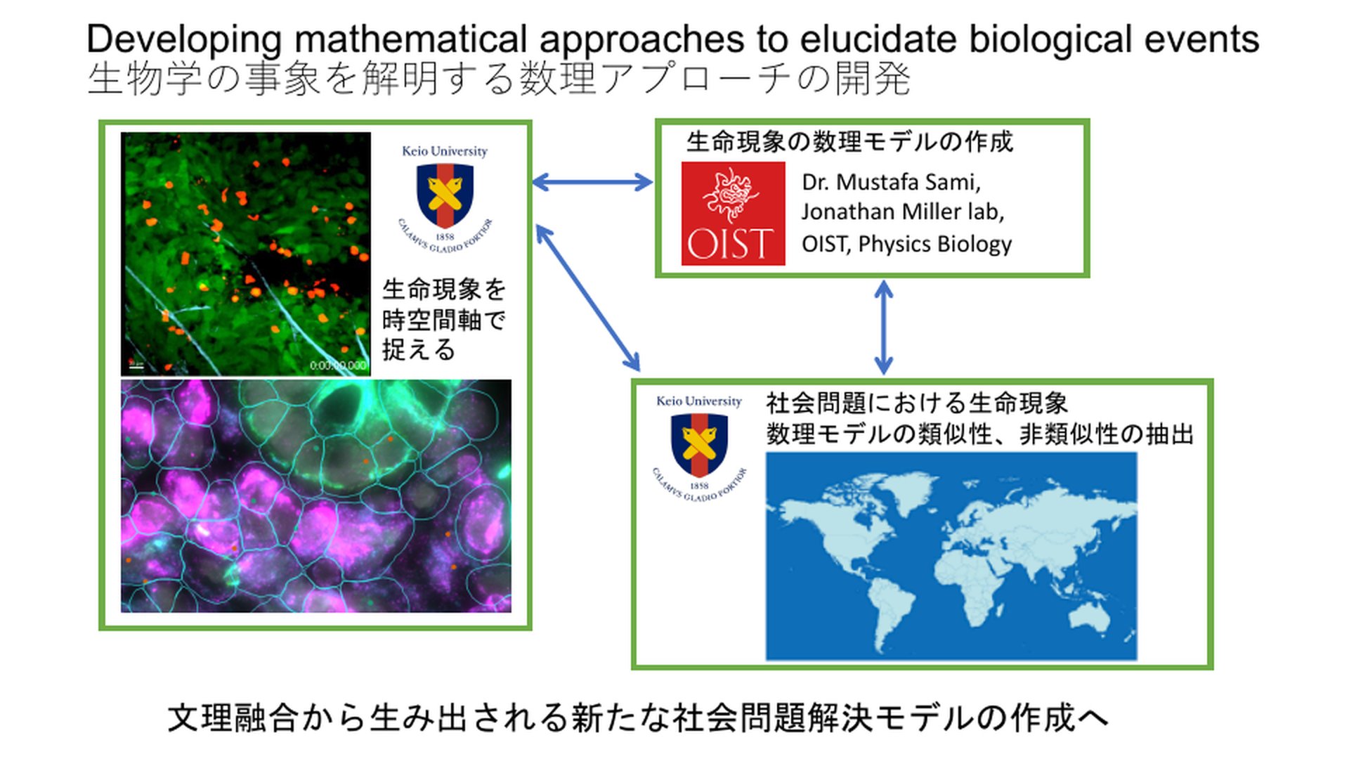 The development of science and technology, including imaging technology and single cell analysis, has made it possible to capture various life phenomena at high speed and high resolution. Until now, life phenomena have been analyzed by converting them into simplified mathematical formulas, but in collaboration with OIST, we will attempt to convert increasingly complex life phenomena into mathematical formulas from a new perspective. Furthermore, we will build a platform to find clues to solving new social problems by analyzing the similarities and dissimilarities between the mathematical formulas obtained from these life phenomena and various social problems.