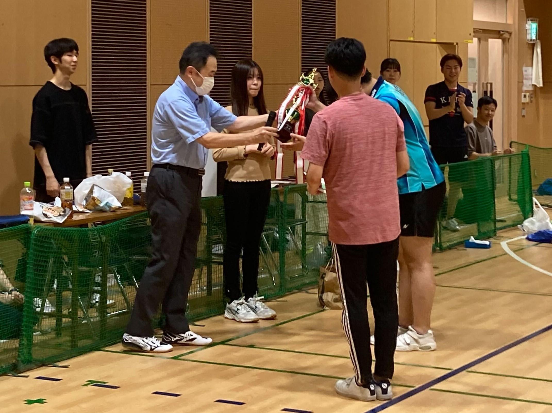 At the awards ceremony, Professor Tadanori Osawa, chairman of the Faculty of Pharmacy Table Tennis Club, presented the championship trophy. The runner-up was the Laboratory of Molecular Oncology and Pharmacology, and third place went to the Laboratory of Molecular Synthetic Chemistry, repeating their performance from last year.