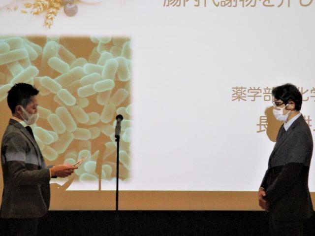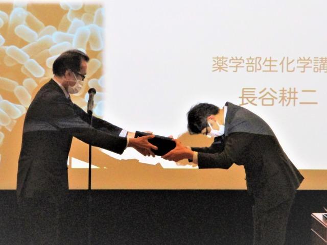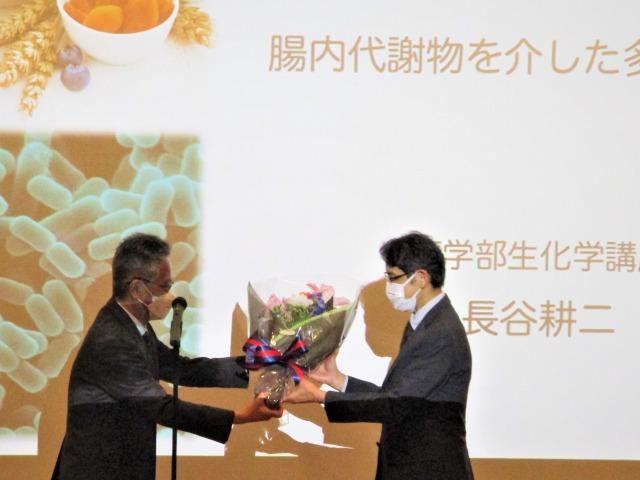 This was followed by the presentation of a bouquet of flowers from Hidemi Misawa, Dean of the Faculty of Pharmacy, and a commemorative gift from Daisuke Takahashi, Senior Assistant Professor in the Department of Biochemistry.