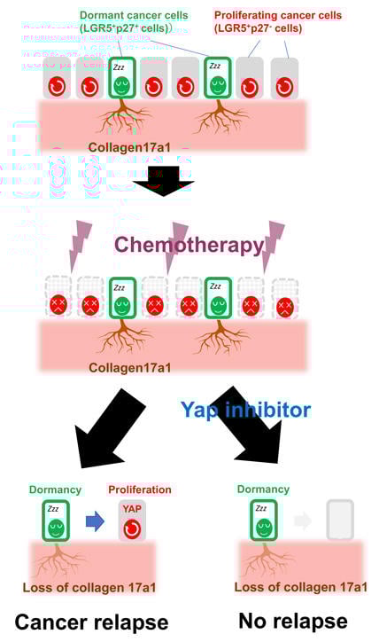Encouraged by these findings, Prof. Sato and his team, which also comprised researcher Yuki Ohta and assistant professor Masayuki Fujii, both from Keio University School of Medicine, asked another important question: how do these cells remain dormant and tolerate chemotherapy? To answer this question, they performed a large-scale analysis of gene expression in this specific group of cells. To their surprise, they found that these cells show an unusually high expression of the collagen protein COL17A1, which allows the cells to sleep through chemotherapy and survive. More intriguingly, chemotherapy disrupts COL17A1, reawakening these cells and causing them to proliferate. This leads to the recurrence of CRC.