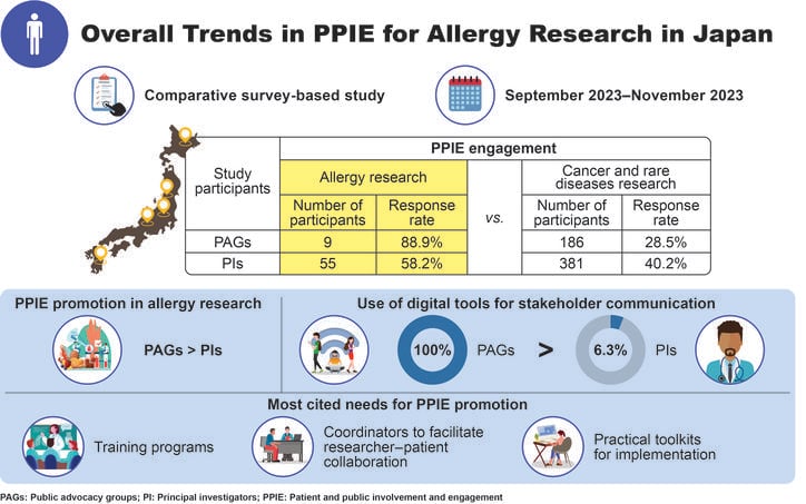 A team of researchers from Keio University School of Medicine, the Institute of Medical Science at the University of Tokyo, and the National Center for Child Health and Development has reported the first cross-disease, cross-stakeholder survey on PPIE in Japan. The study compared allergy research with cancer and rare diseases, fields where PPIE has already advanced.