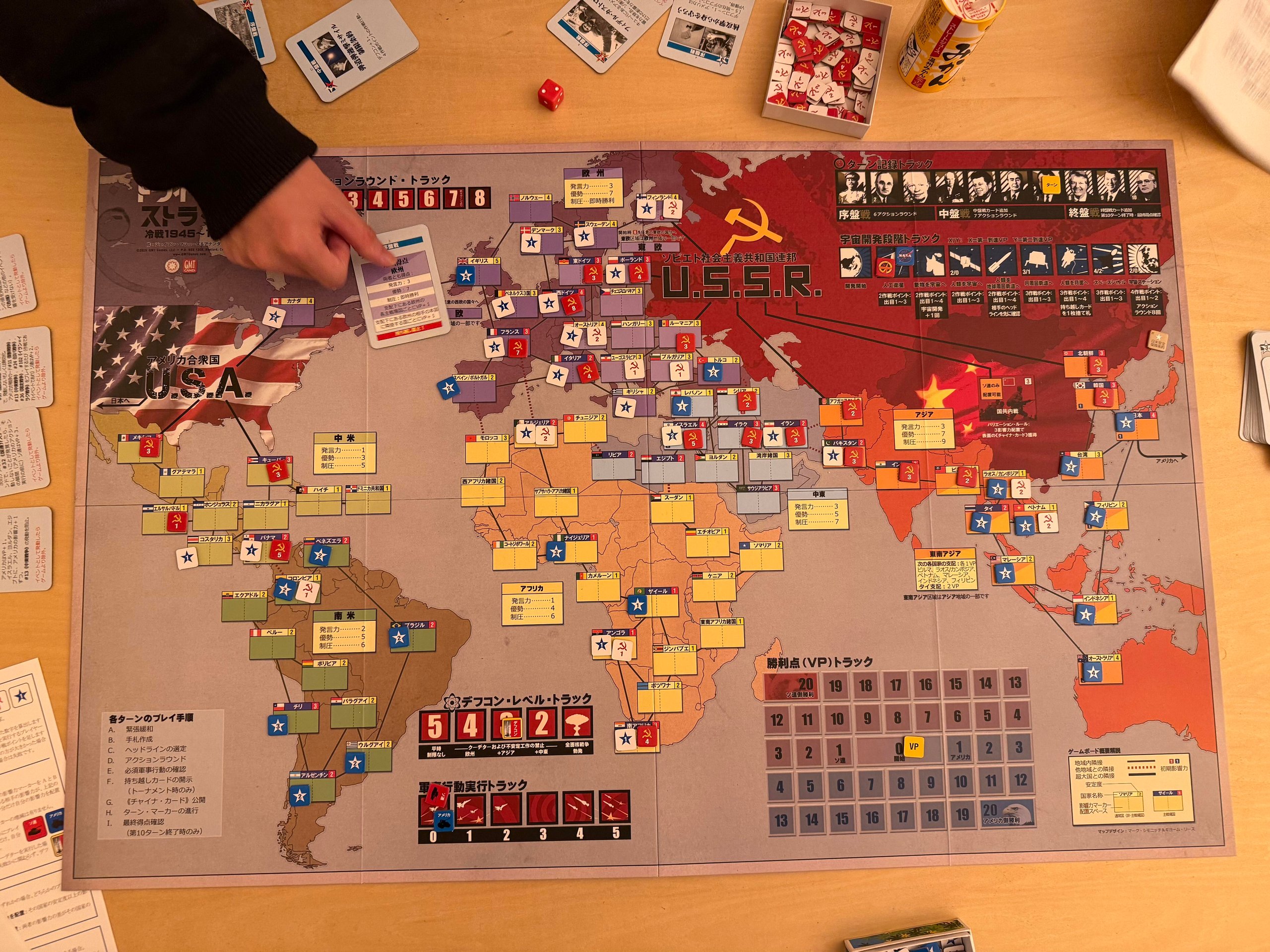 本ワークショップでは、主に外交・安全保障や戦略に関心のある高校生を対象として、戦略や安全保障に関する基礎的な知識を学びながら、東西冷戦時代におけるアメリカ合衆国(米国)とソビエト社会主義共和国連邦(ソ連)との国家間競争を題材に、市販の戦略ボードゲーム『トワイライト・ストラグル』を用いて、国家レベルの意思決定の疑似体験を行います。参加者は、米国またはソ連の戦略チームの一員として、政治的・軍事的緊張の高まりを管理しつつ、核戦争を回避しながら、自国の影響力をいかに拡大していくかという視点で戦略を構築・実行していきます。ゲーム中では、冷戦期に実際に起きた出来事を反映したイベントカードを用いて、影響力の配置、クーデター、不安定化工作、宇宙開発競争など、さまざまな手段を駆使して状況を動かします。なお、ゲーム内には「デフコン(Defense Condition)」と呼ばれる、軍の戦闘準備態勢を示す指標に基づいた概念が導入されており、これに相当する5段階の警戒レベルが設定されています。最も深刻なレベルであるデフコン1に達すると核戦争が発生し、その引き金を引いた側が敗北するというルールが採用されています。これは、冷戦当時の核抑止の論理や国際政治の緊張構造を象徴的に再現したものです。このようなシミュレーションを通じて、戦略的思考や状況判断の難しさを体感しながら、SFCで展開されている地域・戦略・技術分野における、実践的かつ学際的な学びへの期待を高めてもらえれば幸いです。