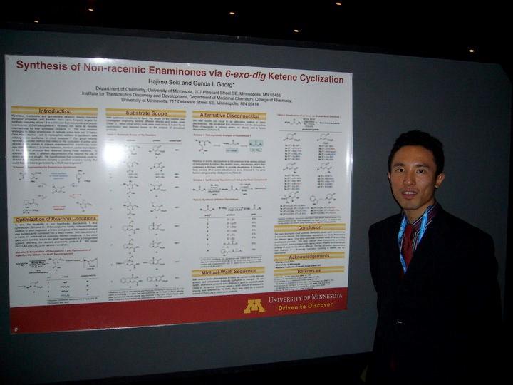 After moving to the U.S. in the summer of 2006, I enrolled in the Department of Chemistry at the University of Minnesota, and for the first two years, I spent my time taking classes and serving as a teaching assistant (TA), supervising student experiments. Teaching experiments as a TA was very enjoyable, and my English improved by communicating with the local students. After that, I decided to join the laboratory of Professor Georg, who had moved from the University of Kansas, and started my research life. In American laboratories, there is not the same kind of detailed guidance as in Japan, and everyone is placed in an environment where they must solve their own problems as independent scientists. However, thanks to the perseverance and experimental techniques I had developed in the Kakiuchi Laboratory, I successfully obtained my Ph.D. in 2011.