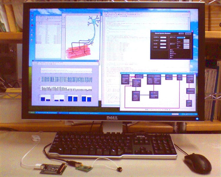 In our daily lives, we casually move our legs to walk down a path and extend our hands to grasp a cup. This is made possible by the brain, a mass of 14 billion nerve cells, exchanging signals with each other and commanding the muscles in our limbs to contract in the correct sequence and with the right amount of force. By understanding the mechanisms behind motor expression, we can delve into how brain diseases like stroke and Parkinson's disease cause limb impairment, which will allow us to advance research toward establishing new treatments. To understand and utilize the brain, we analyze brain activity during movement with ourselves as subjects (fig. 1) and virtually construct neural networks within computers and electronic circuits to verify their behavior (fig. 2).