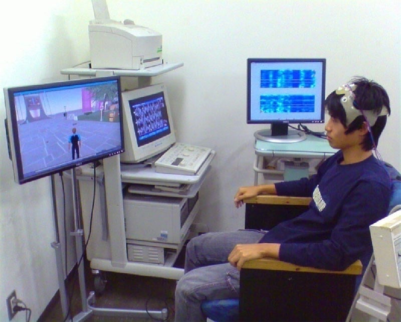 While we engage in this research to "know the brain," we have also recently begun research to "use the brain"—reading brain states in real time and operating external devices such as computers in response to changes in those states. This technology, which will help people with limb impairments and enrich their lives, is called a Brain-Machine Interface (BMI) and is being actively researched worldwide. The day when you can move a computer mouse cursor just by thinking, or have a robotic hand grasp a cup in place of your own—events that seem like they're straight out of a science fiction novel or movie—is actually just around the corner. Our research team has developed a technology to move a character in the 3D virtual reality world "Second Life" based on the user's motor imagery of their feet or hands (fig. 4). We plan to release an updated version within this year that will allow users to enjoy conversations with other characters and buy clothes they like at shopping malls within the virtual world. This technology, which merges the real and virtual worlds as depicted in the movie "The Matrix," is attracting significant attention both domestically and internationally as a way to support the daily lives of patients with quadriplegia for whom treatment is difficult.