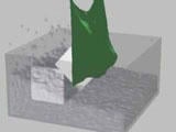 By teaching the computer physical laws, such as the gravity that acts on noodles as they fall from above, it is possible to create motion like that shown in Figure 1. Furthermore, by considering factors like collisions between the noodles and placing a large number of them in a container, an image like the one in Figure 2 can be created. Figure 3 shows snowfall and snow accumulation using a similar concept, and Figure 4 expresses the movement of ice in water and cloth. By slightly altering the physical laws, it is also possible to create movements that would be impossible in the real world.