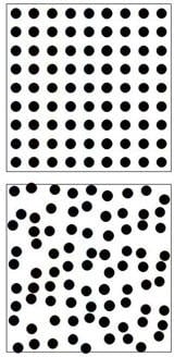 In a crystal, atoms are arranged periodically. This is described as having long-range periodic order. Just as ice turns into water when its temperature is raised, a crystal turns into a liquid when its temperature is increased. The volume change at this point is only a few percent, so the average distance between atoms remains almost the same, but the arrangement of atoms loses its long-range periodicity.