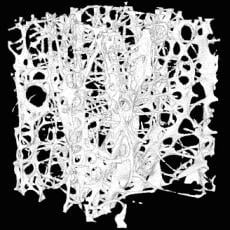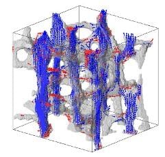 Figure 2 shows the lumbar cancellous bone of a patient with osteoporosis, a condition where bones become porous and prone to fracture. In this example, the bone density in the cancellous bone region is only about 7%. One of the roles of bone is to support body weight and withstand the forces applied during movement. Similarly, even at the micrometer scale, the trabeculae bear a portion of the load. Figure 3 shows the calculation results, with the trabeculae responsible for supporting body weight highlighted in blue.