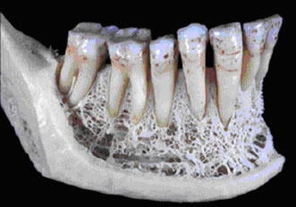 Additionally, as is evident from orthodontic treatment, the jawbone is also deeply related to mechanics. As shown in Figure 4, cancellous bone also exists in the jawbone. Figure 5 shows the results of a calculation of how forces are transmitted from a dental implant—a treatment for tooth loss—to the cancellous bone. These results have provided new insights into the role of the trabeculae surrounding the implant and bone metabolism.