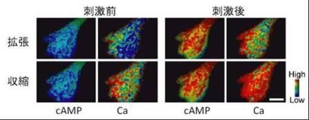 In cardiomyocytes, the intracellular calcium concentration (Ca) increases during systole, but the cyclic adenosine monophosphate (cAMP) concentration does not change (the four figures on the left; stronger red indicates higher concentration). On the other hand, when a stimulus that increases the intracellular cAMP concentration is applied, the Ca concentration during contraction increases along with the rise in cAMP concentration (the four figures on the right). Modified from Niino Y, Hotta K, Oka K (2009) PLoS ONE 4(6): e6036.