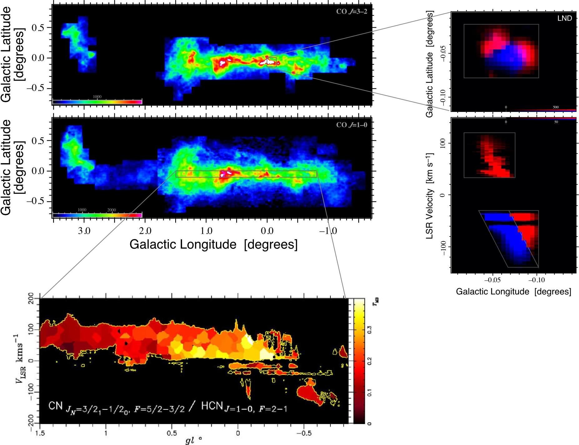 Our laboratory, established in April 2008, is a very new lab and the only experimental astrophysics laboratory at Keio University. Here, we primarily study the activity at the center of the Milky Way based on spectral line observations using radio telescopes (see photo). Molecules and atoms each emit electromagnetic waves (spectral lines) at specific frequencies. When gas is moving relative to us, the frequency of the spectral lines changes due to the Doppler effect. By measuring the intensity and frequency of these spectral lines, we can determine the physical state, chemical composition, and motion of the gas drifting in space. The latest observational results have uncovered evidence that the currently dim nucleus of the Milky Way was extremely bright in the past (Fig. 1), as well as a rotating gas disk that will serve as fuel for it to shine again in the near future (Fig. 2). In other words, to put it simply, our Milky Way galaxy also has periods when its nucleus shines brightly. We look at other galaxies and make all sorts of assumptions, but perhaps from the perspective of a distant galaxy, they might be thinking something like, "That spiral galaxy's nucleus is strangely bright; it must be a terrible place to live."
