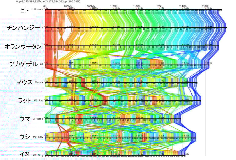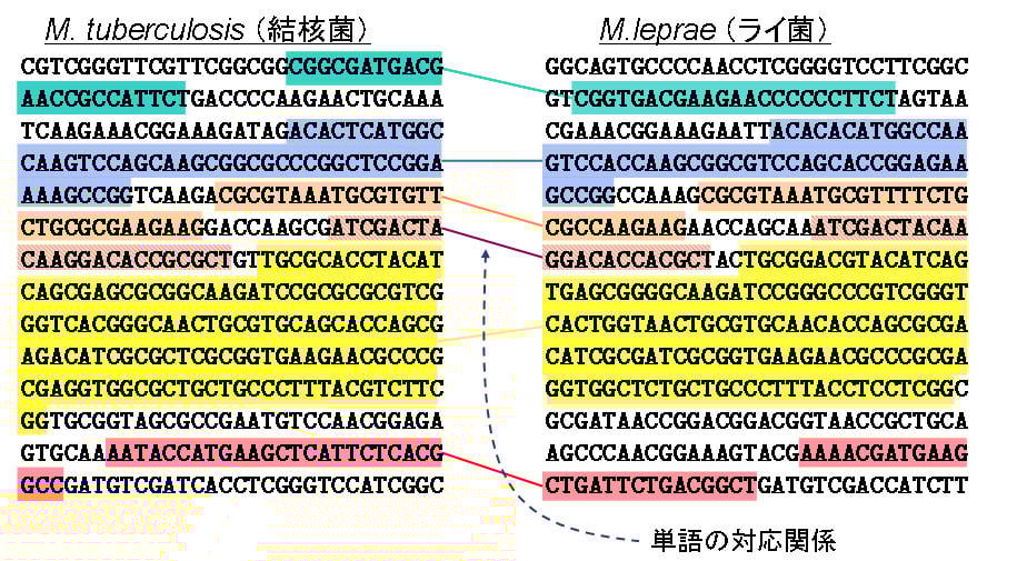 Furthermore, a difficult problem in sequencing a genome is its enormous data size. The length of the string above is 336 characters (technically, 336 base pairs), but the entire genome of *Bacillus subtilis natto* is 4.09 million base pairs, making it about 12,000 times larger. In the case of humans, the genome size is 3 billion base pairs, an enormous amount of data approximately 8.9 million times larger. To analyze such vast data, research in bioinformatics, which combines computers with a method called comparative genomics to analyze genomic information, is being actively pursued. For example, the two DNA sequences in Figure 2 are parts of the genomes of *Mycobacterium tuberculosis* and *Mycobacterium leprae*, both bacteria that infect humans and cause disease. Here, we are finding and comparing parts that correspond to similar "words" in the text strings. DNA sequences that contain many such similar words can be regarded as sentences that mean the same thing. Furthermore, a comprehensive comparison of many entire genomes of higher organisms, including humans, provides an overview like the one shown in Figure 3.