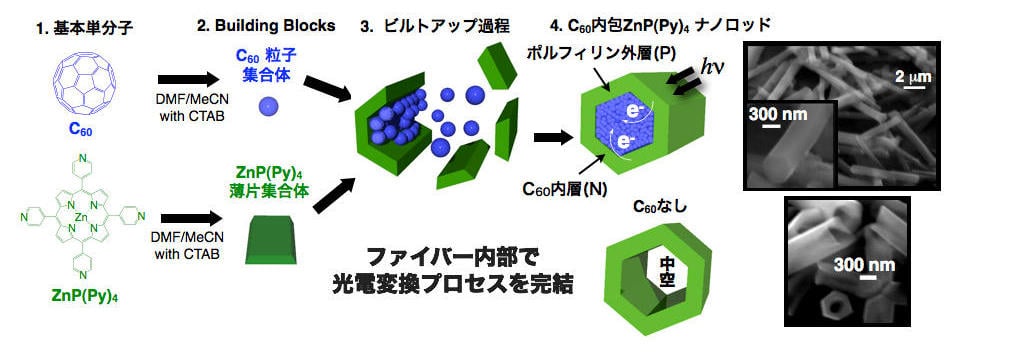 If anisotropic rod-shaped assemblies can be synthesized instead of isotropic particulate ones, new functions and developments can be expected, such as improved optical and electronic properties due to enhanced crystallinity and directional control of carrier transport. Using different bonding modes (coordination bonds and intermolecular forces) as driving forces, we also succeeded in creating fullerene-encapsulated porphyrin nanorods, as shown in Figure 2, with a fullerene (N) layer on the inside and a porphyrin (P) layer on the outside. In this rod-shaped structure with two separate inner and outer layers, systematic operation of photoelectric conversion is expected—light absorption in the outer P layer, charge separation at the P/N junction interface, and carrier transport in the respective P and N layers. Indeed, good carrier charge generation and photoresponse across the entire visible light spectrum were observed.