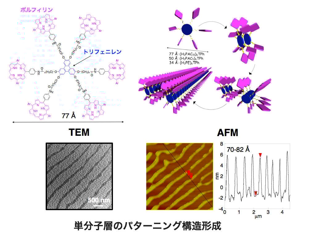 The molecular assemblies presented in this article can be applied not only to photoelectric conversion, such as in solar cells, but also to a wide range of other fields, including general electronics and catalytic systems, by pre-programming them with the required functions. For example, by utilizing the carrier charges generated during photoelectric conversion, they can also be used for chemical energy conversion (such as hydrogen production) and material conversion. Recently, we also designed and synthesized a porphyrin hexamer with triphenylene, a type of polycyclic aromatic hydrocarbon, as the central stacking unit, as shown in Figure 4. Simply by dissolving this hexamer in an organic solvent, casting it onto a substrate, and drying it, a unique and clean linear monolayer pattern structure appears. This patterning is expected to be developed as "molecular wiring" for future ultra-fine electronics technology. Thus, molecular assembly chemistry, which utilizes synthetic chemistry and supramolecular chemistry, is not limited to mere manufacturing in the field of chemistry but is expected to play an important role in materials science in the future.