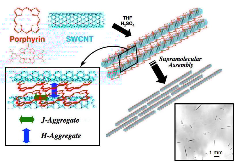 Unlike the spherical molecule fullerene C60, carbon nanotubes (CNTs), which have a characteristic cylindrical structure, are expected to exhibit good carrier transport. Furthermore, if porphyrin molecules, which have a two-dimensional π-planar structure, can be systematically coated onto the CNT surface (supramolecular organization), it would be possible to improve not only solubility but also light-harvesting and charge separation properties, leading to applications in photoelectric conversion devices. We investigated the supramolecular organization of porphyrin and single-walled carbon nanotubes (SWCNTs) and succeeded in constructing rod-shaped assemblies as shown in Figure 3. When a photoelectric conversion cell was similarly fabricated, the coating of the SWCNT surface with porphyrin (forming a P/N interface) resulted in a significant, two-orders-of-magnitude improvement in photoelectric conversion characteristics compared to a system with SWCNTs alone.