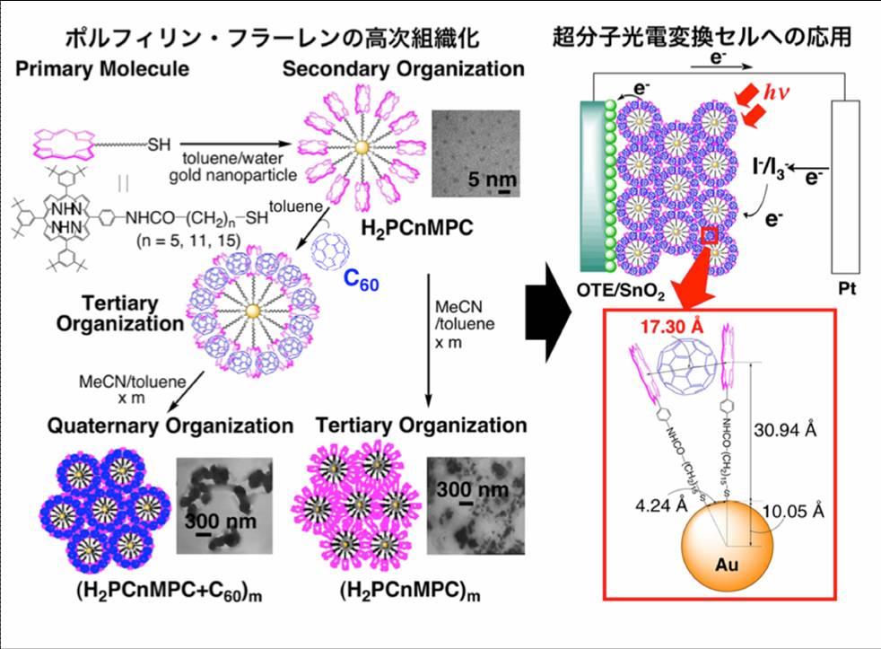 The organic molecules used here include porphyrin (an electron-donating molecule: P), which has a structure similar to chlorophyll, a pigment in natural photosynthesis, and the spherical molecule fullerene C60 (an electron-accepting molecule: N). Both have a molecular size of about 1 nanometer. Figure 1 shows an example of the process of higher-order self-organization. First, porphyrin is organized with gold nanoparticles via covalent bonds through an alkanethiol chain. Meanwhile, when fullerene is mixed in a good solvent in which it dissolves easily (toluene), supramolecular formation of porphyrin-fullerene occurs, enabling the construction of a P/N junction interface (charge separation interface) at the single-molecule level. Next, by mixing them in the presence of a poor solvent in which they do not dissolve well (acetonitrile), particulate assemblies of about 100 nm in size are formed, which can impart both light-harvesting and carrier transport functions within the assembly. In particular, lengthening the alkyl chain spacer (n=5, 11, 15) subtly changes the distance between the nearest two porphyrin molecules, making it easier for fullerene to be incorporated. In other words, this means that the P/N junction interface has been precisely controlled at the molecular level. In fact, when a solar cell is fabricated by forming a thin film of these particulate assemblies on an electrode substrate, the photocurrent response extends not only over the entire visible light region but also into the near-infrared region (around 950 nm) derived from the charge-transfer absorption band. The photoelectric conversion characteristics show an incident photon-to-current conversion efficiency (IPCE value) of about 60% and a photoelectric conversion efficiency of about 2%, achieving an approximately 50-fold improvement in photoelectric conversion efficiency through higher-order self-organization. A similar effect was obtained using this assembly design strategy with dendrimers, which are dendritic polymers, and chain-like polymers.