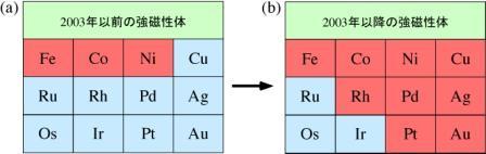 Figure 2. Elements known to be ferromagnetic at room temperature (a) and elements in which ferromagnetism was discovered at the nanoscale after 2003 (b).