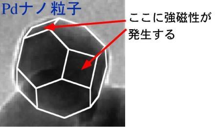 Do you know how many substances composed of a single element exhibit ferromagnetism at room temperature? Excluding gadolinium, a metal that loses its ferromagnetism around room temperature, there are only three, as shown in red in Figure 2(a). That's quite a small number, isn't it? It seems natural, then, to think about finding ways to increase the number of ferromagnetic substances. One method we devised to turn non-magnetic materials into ferromagnets was to reduce them to the nanoscale. In 2003, the Sato Laboratory was the first to discover that by reducing palladium (Pd), a non-magnetic metal, to the nanoscale, ferromagnetism emerges on the particle surface (Figure 3). This is caused by a change in the energy state of electrons on the material's surface, which makes it more difficult for electrons within the metal to move. Following this discovery, various other materials that exhibit ferromagnetism at the nanoscale were found around the world (Figure 2(b)). Furthermore, by carefully considering this phenomenon, we can see that new ferromagnets can be created by applying an electric field or irradiating the material with light. We are currently proposing various methods to create new ferromagnets, aiming to further expand the range of substances that exhibit ferromagnetism.