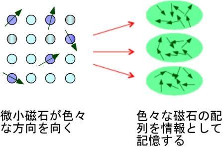 Figure 4. In a spin glass, the microscopic magnets point in random directions, but each of their diverse arrangement patterns can be considered a single piece of information. These arrangement patterns are related to multi-level memory and associative memory.