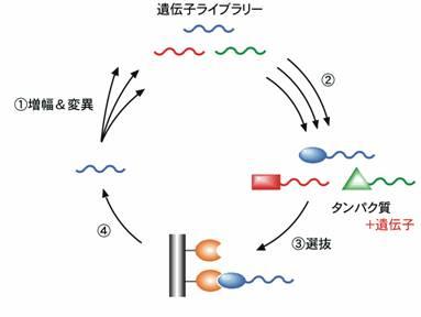 To actually evolve proteins in the laboratory using this principle of repeated "mutation" and "selection," various creative steps are necessary. As an example, let's consider the case of artificially evolving a protein that binds to a certain target molecule to improve its binding affinity (Figure 1). First, using a technique called PCR, we introduce mutations into the protein's gene while amplifying it, creating a diverse population (library) of mutants (Figure 1 ①). Next, this population of genes is biologically converted into a population of proteins (Figure 1 ②). The key point here is to use our original technology to physically link the protein to its gene. Finally, using a column to which the target molecule has been pre-immobilized, we select only the proteins that bind strongly to the target molecule (Figure 1 ③), and then recover the linked genes (Figure 1 ④). The base sequence of the recovered DNA can be easily read by an automated sequencer. We introduce further mutations based on this gene and repeat this evolutionary cycle. By making the "selection" conditions more stringent as the cycles progress, we can gradually evolve proteins with higher binding affinity.