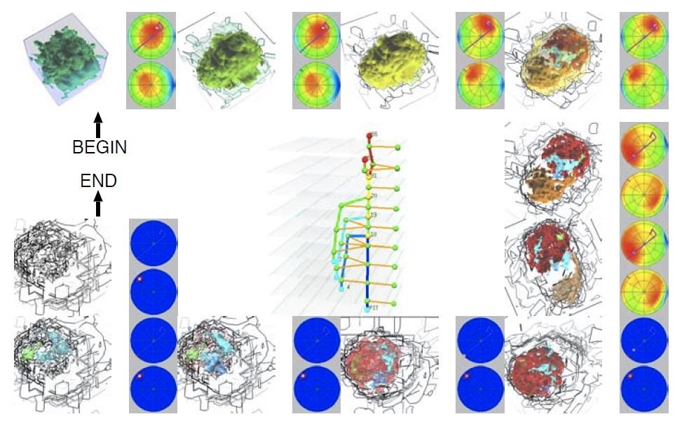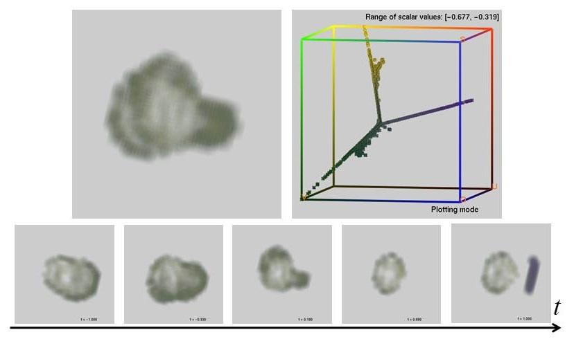 2) Spatio-temporal comprehensiveness: Figure 2 shows an example of tracking the temporal change in charge density distribution during a proton-hydrogen atom collision, using a manifold learning user interface that can exhaustively identify partial spacetimes with characteristic differential phase structures from time-series 3D data (3) .