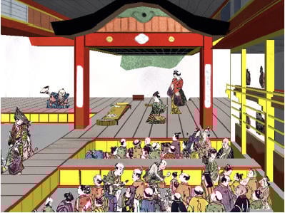 4) Perceptually acceptable deformation: In Figure 4, the size of each object in the live scene is appropriately controlled according to its deviation from linear perspective cues (beams, railings, wood grain), and the entire screen is deformed to an extent that is unnoticeable to the audience (5) . In fact, this naturally achieves the clever composition of Uki-e (Ukiyo-e with perspective), which makes it easier to understand the scene on the forward-tilted stage while conveying the lively atmosphere of the playhouse with sufficient realism.