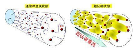 After Onnes's discovery, superconductivity was confirmed in various metallic substances other than mercury. However, it took a long time to elucidate the mechanism of this phenomenon, with the final answer being provided in 1957 by Bardeen, Cooper, and Schrieffer. Today, this theory is called BCS theory, after the initials of these three scientists. BCS theory subsequently had a major impact on the development of various fields, including not only superconductivity physics but also condensed matter physics, particle physics, nuclear physics, and astrophysics, and is hailed as a "monumental achievement of 20th-century physics." How does superconductivity work? To truly understand this, one needs knowledge not of "classical physics," which describes the physical phenomena we normally see, but of "quantum physics," which governs the microscopic world at the atomic level. However, on an "imaginary" level, it can be pictured as follows: In a normal metallic state (Figure 2, left), when electrons flow through a wire, they are obstructed by impurities and other obstacles, preventing them from moving straight, which gives rise to electrical resistance. In a superconducting state, however, as shown in Figure 2 (right), electrons form pairs, which then intertwine to form a large "mass" that flows in unison as an electric current. By moving as a collective "mass," they can overcome obstacles (impurities) that would have scattered individual electrons, allowing them to flow through the wire without resistance. To use an analogy, imagine a very bumpy road for a toy car. If you were to gather a large number of toy cars, melt them down (as wasteful as that sounds), and use the material to build a giant dump truck, it could drive over the road with ease. Of course, this is just an explanation at an imaginary level. After all, superconductivity is a phenomenon that is 100% quantum mechanical! Why do electrons form pairs (since electrons have a negative charge, they should normally repel each other and be unable to stick together!)? What does it mean for these pairs to intertwine and form a mass? Even if they flow in unison as a mass, wouldn't there still be some resistance? If your head is now filled with such questions, you are already captivated by superconductivity. If so, I encourage you to step into the world of physics.