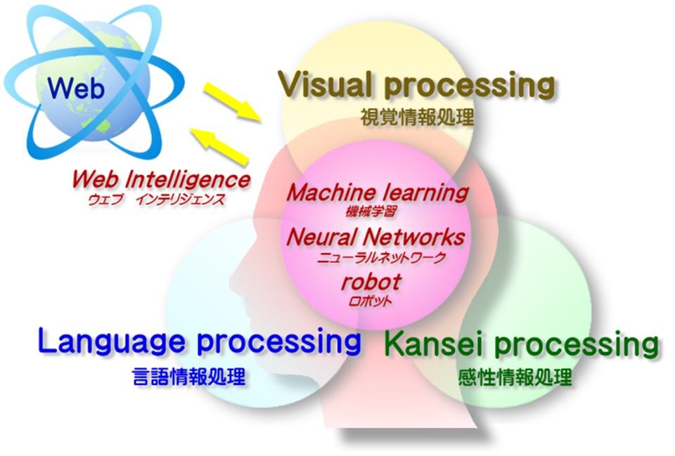 It is said that humans have five senses, but in our laboratory, we are conducting research focusing on the following three types of information processing: visual information processing, which handles input from the eyes; language information processing, which makes full use of words; and Kansei/affective information processing, which deals with emotions and sensibilities, the core of humanity. And we are conducting research aimed at integrating these.