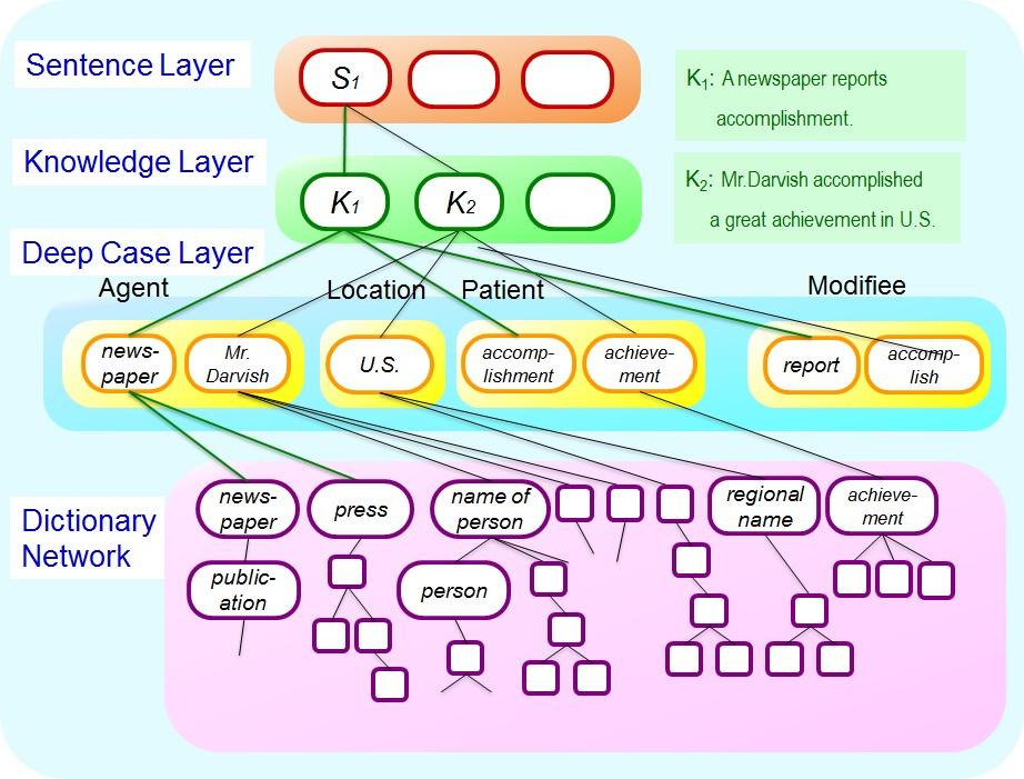 (2) Language Information Processing: Our laboratory has been conducting research on language processing using neural networks for a long time. In 2013, we received the Best Research Award from the Japanese Neural Network Society (Japan's academic society for neural networks) for the development of a language processing neural network like the one shown in Figure 5. The major features of this neural network are its ability to handle complex input sentences, its automatic consideration of deep cases, its capacity for associative processing via the dictionary network at the lowest layer, and its ability to answer questions using these functions.