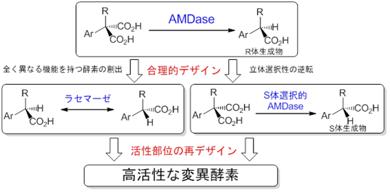 Parameters such as an enzyme's substrate specificity and maximum velocity are fixed, and it has long been considered extremely difficult to alter them easily. Among these challenges, improving enzyme activity through mutagenesis was the most difficult task, and few researchers attempted it. Recently, by applying rational design to an arylmalonate decarboxylase (AMDase) that we originally discovered, we have succeeded in creating mutant enzymes with activities not found in nature, such as an S-selective AMDase with inverted stereoselectivity and a racemase that acts on unnatural compounds. Furthermore, by redesigning the active site through the introduction of mutations at a few specific amino acid sites, we have successfully increased the activity by tens to ten thousand times. A 10,000-fold increase in enzyme activity means that the cost of an enzyme in a certain manufacturing process could be reduced from one million yen to 100 yen, which has an extremely large industrial impact. In this way, we were able to demonstrate that enzyme activity can be improved through rational design.
