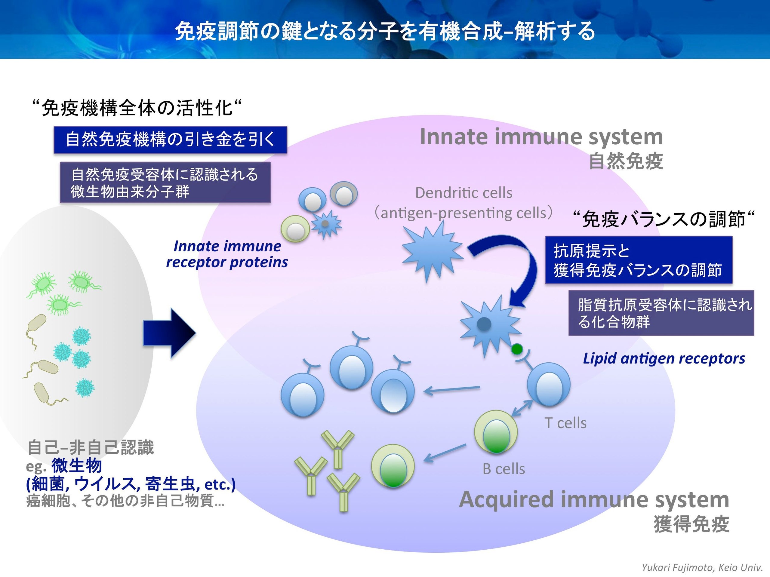 In our laboratory, our research focuses on the "shape and function" of molecules involved in biological defense, primarily those found in nature and within living organisms. "Shape" refers to the chemical structure, while "function" includes aspects such as affinity for other specific molecules, biological activity, and distribution and behavior within cells or the body. We are particularly interested in the group of molecules (many of which are derived from microorganisms) that trigger the initial activation of innate immunity, leading to the activation of the entire immune system, as well as the molecules that determine the balance of the adaptive immune system, typified by antibody-antigen reactions (Figure 1). To elucidate the roles played by our target molecules (compounds), we first perform organic chemical synthesis of natural compounds with immunomodulatory properties to obtain them in pure form. We then use these compounds to analyze their functions. Synthesis technology is applicable to the creation of all kinds of organic compounds—not only natural bioactive compounds but also those for drug discovery, electronic materials, and polymer materials—and is a technology that underpins modern human life.