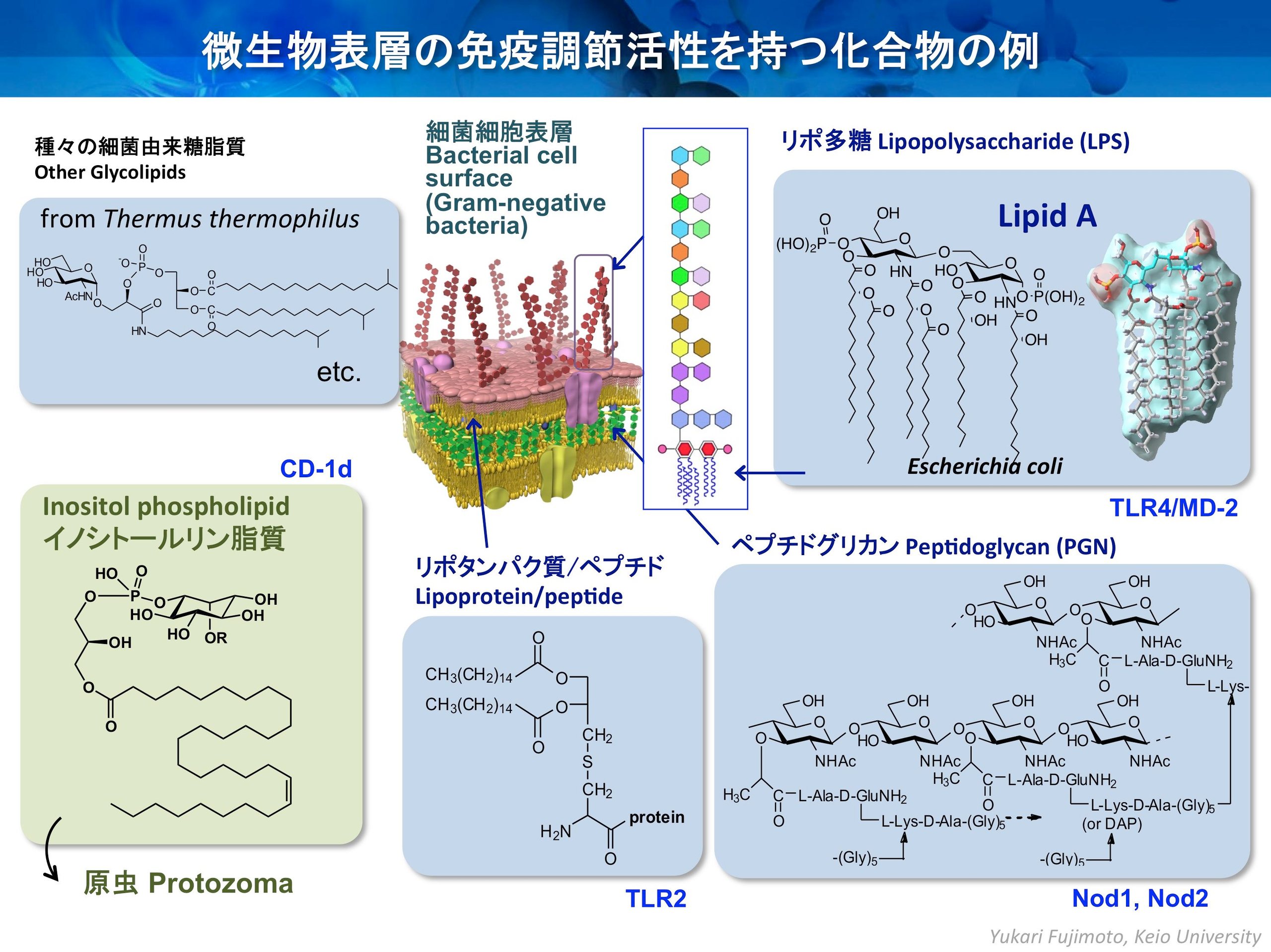 Figure 2 shows examples of immunomodulatory compounds derived from the surfaces of natural microorganisms. Many of these have structures known as complex lipids or complex carbohydrates. Since it is theoretically possible to eliminate cancer by activating only the immune response against cancer cells if we can successfully regulate the immune system's balance by combining the functions of several active molecules, we are also conducting research aimed at designing and creating molecules that can selectively regulate the immune system.