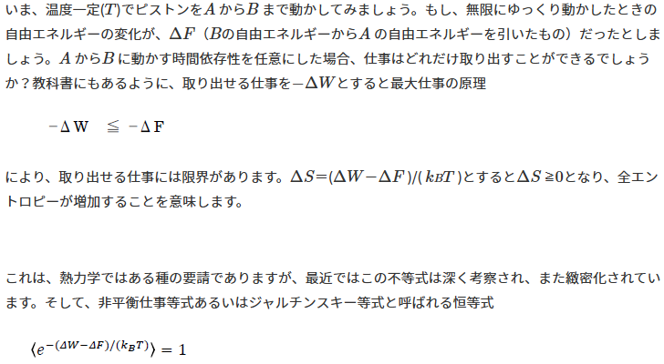 is known to hold true. Here, <...> signifies the average over all possible parameter changes of the external world (called a heat bath). This equality reproduces the principle of maximum work if one uses a mathematical inequality called Jensen's inequality.