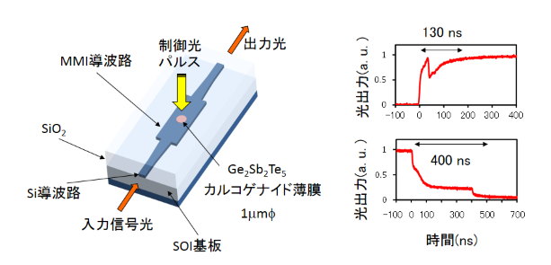 Our laboratory focuses on research essential for advancing photonic networks, such as optical switches, optical multiplexing/demultiplexing circuits, and optical devices for new wavelength bands. While the research and development of linear optical circuits are useful and promise reliable results, research on nonlinear optical circuits is challenging and intriguing. In particular, as shown in Figure 3, we have proposed an optical switch that uses a phase-change material with a large refractive index change and memory properties as a nonlinear optical device. [2]