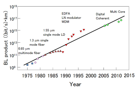 On the other hand, in photonic networks, optical transmission systems using optical fibers as the transmission medium have made dramatic progress. The figure of merit for these systems is measured by transmission speed × transmission distance, and today it is approaching 1017[(bit/s)km]. In optical transmission systems, the disadvantages of optical nonlinearity in optical fibers (such as signal degradation due to self-phase/cross-phase modulation and four-wave mixing) outweigh the advantages (such as Raman amplification), creating a demand for optical fibers with low nonlinearity. Furthermore, various linear optical circuits, such as wavelength multiplexing/demultiplexing circuits and coherent receiver circuits, have been put into practical use and play a crucial role in optical transmission systems.