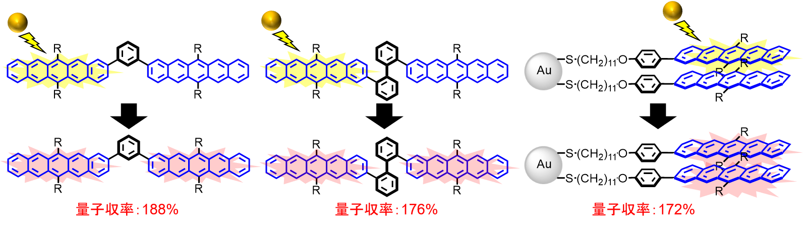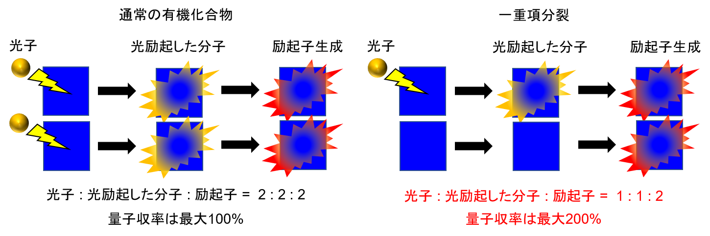 Research on organic light energy conversion materials has been conducted since around the 1960s, but increasing their efficiency remains a challenge. Normally, an organic molecule can only generate one exciton from one photon, but if it were possible to generate two excitons from one photon, the potential for increased efficiency would be extremely high. This dream-like photophysical property, called "singlet fission," was predicted in 1965 to occur between two molecules, and its occurrence was indirectly proven in 1969 (Figure 1).