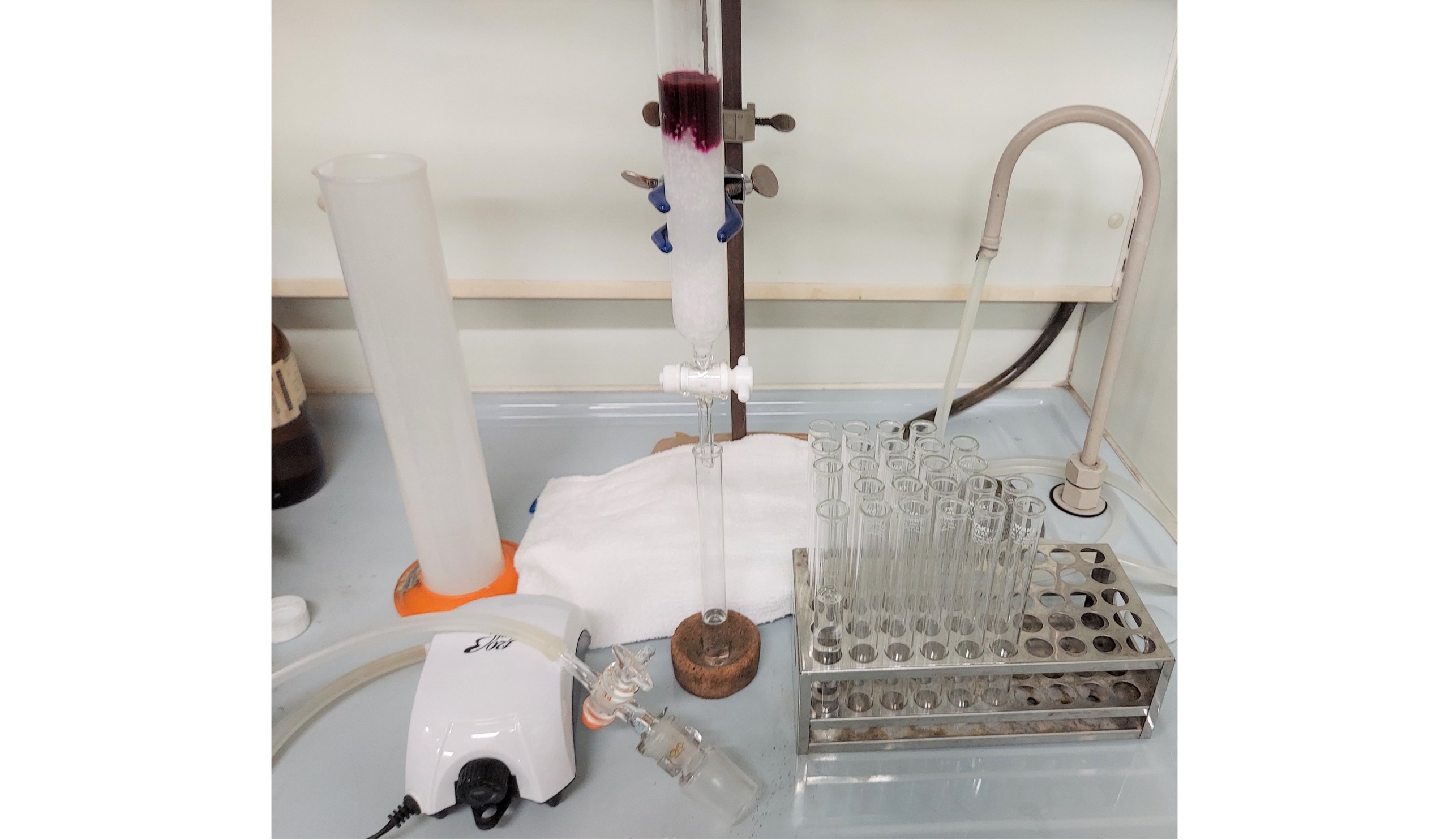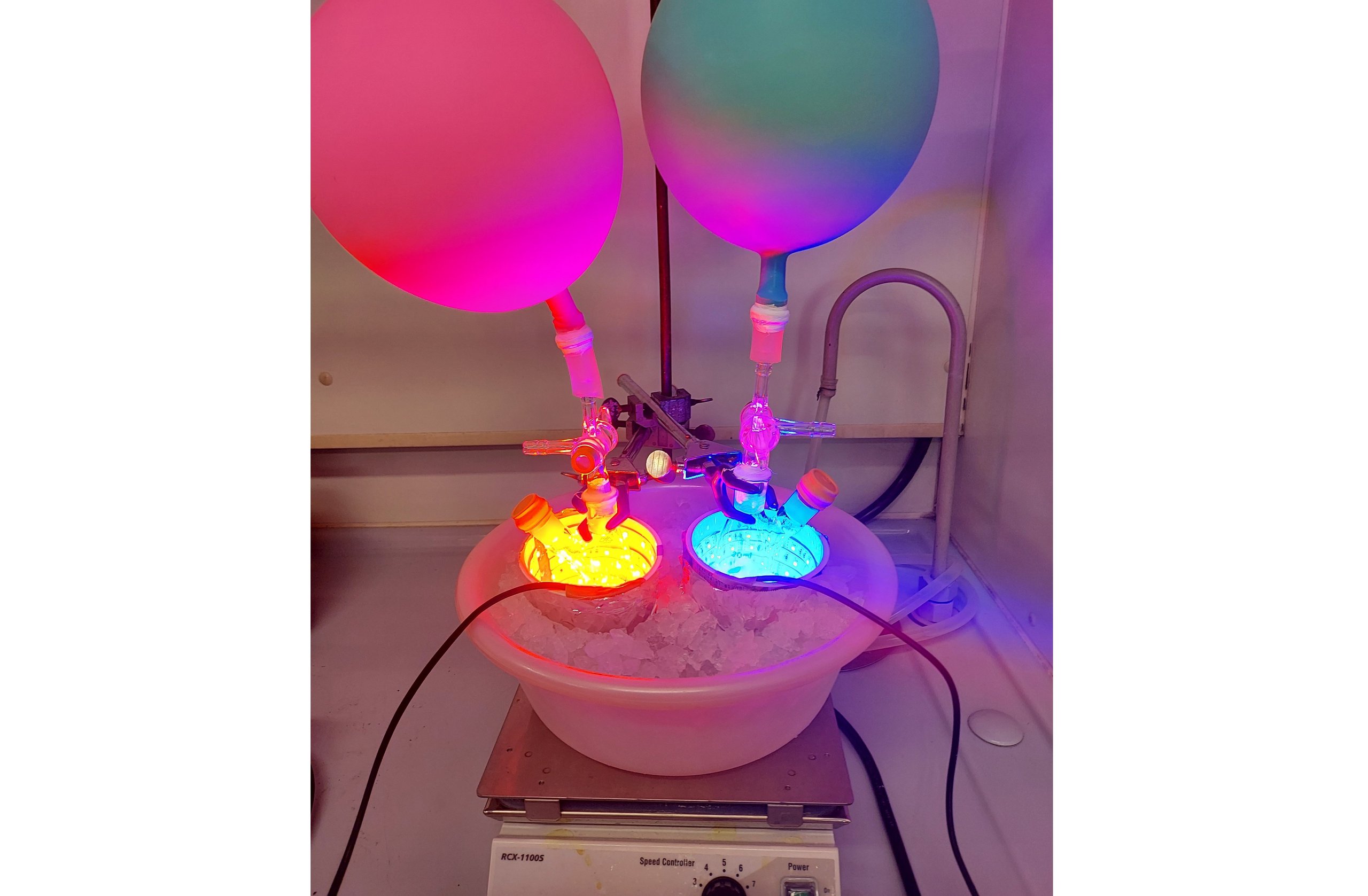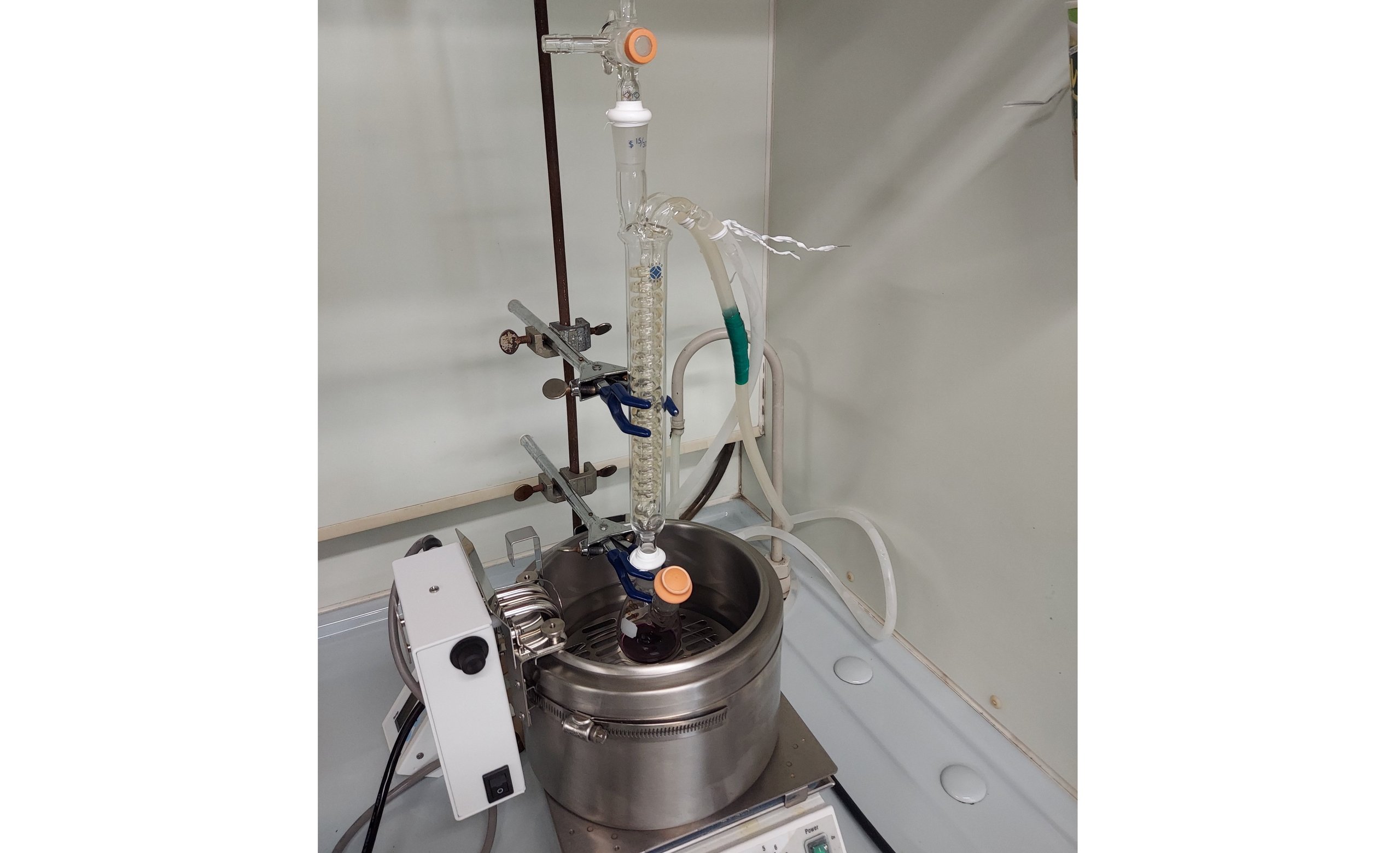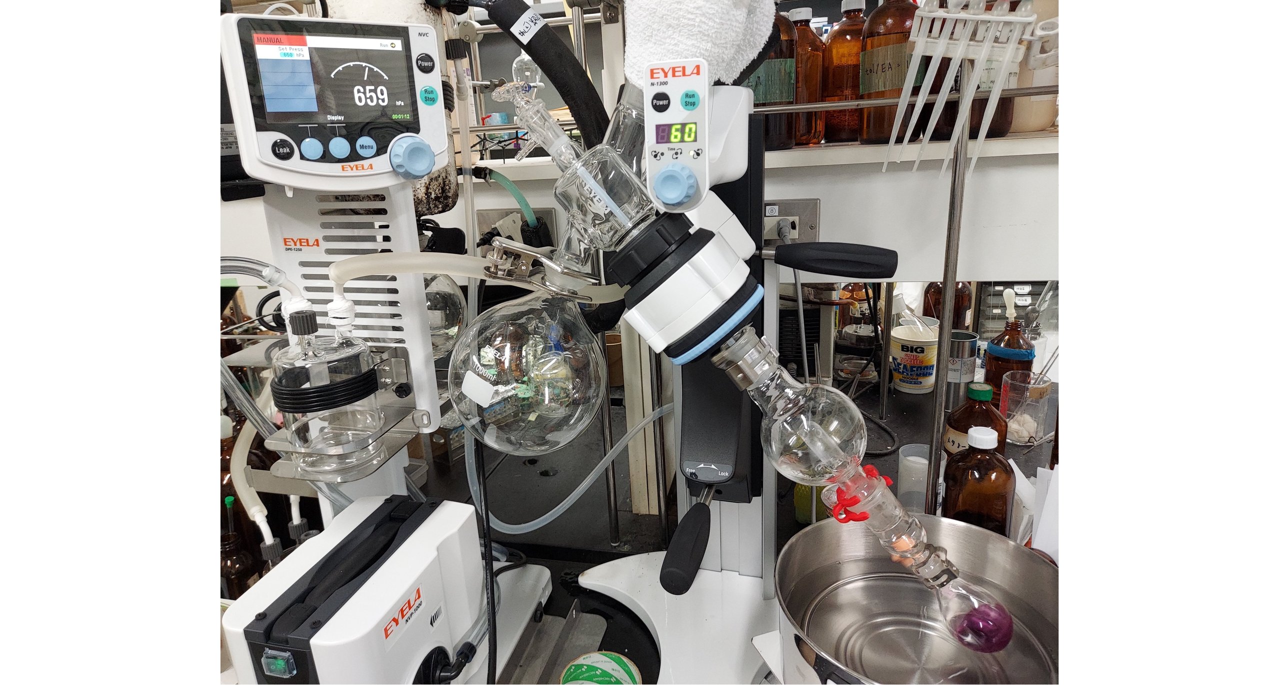 Since being assigned to a laboratory in my fourth year of undergraduate studies, my main research theme within organic synthetic chemistry has been the "synthesis of natural products." Many of you might be thinking, "Huh?" A common question I get is, "Why go to the trouble of making something that already exists in nature?" As I explained earlier, organic synthetic chemistry plays a role as the science of creating artificial substances, and humanity has synthesized a virtually limitless number of organic compounds. So why natural products? The answer is because "nature surpasses human wisdom." Even now, substances with structures never seen before and those with very interesting biological activities are being discovered in nature. Since our targets surpass human wisdom, we cannot tackle them with conventional methods. The development of new synthetic methods and strategies is essential. That is why in our laboratory, we conduct experiments on chemical reactions every day, stepping into an unknown world. The experiments themselves are a lot of fun. We don't just heat flasks in an oil bath (Figure 1); we also concentrate organic solvents with an evaporator (Figure 2), separate compounds using silica gel column chromatography (Figure 3), and sometimes conduct chemical reactions by irradiating them with red or blue light from LED lamps (Figure 4). Experiments with chemical reactions often fail (not explosions, but failing to produce the target compound!), which makes the joy of success all the greater. These experiments may lead to the discovery of novel synthetic methods or the creation of compounds with functions that surpass those found in nature. It is truly a case of "experiments make the impossible possible." We are dedicated to our research every day so that we can contribute, even in a small way, to the advancement of chemistry.
