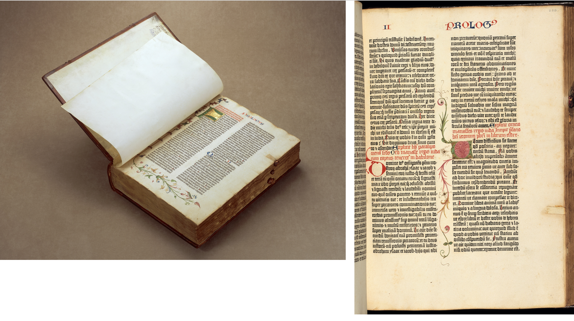Are you familiar with the Gutenberg Bible? It is a book printed by Johannes Gutenberg in Germany in the mid-15th century, using movable-type printing for the first time in Europe. About 50 copies survive in the world, one of which is held by the Mita Media Center (Keio University Library) ( https://dcollections.lib.keio.ac.jp/ja/gutenberg/explanation ).
