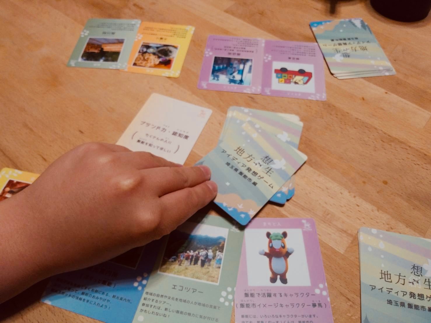 飯能市における活動は、2015年に地方創生推進に関する協定書を締結して以来10年になる。2024年度は、2022年に開発した「地方想生 アイデア発想ゲーム 埼玉県飯能市編」を用いたワークショップを各地で推進した(「地方想生」は地方創生と発想を合成した造語)。とくに2023年に飯能市教育委員会に本ゲームを寄贈した関係もあり、2024年度は小中学校で授業に呼ばれることがあった。写真は飯能市立飯能西中学校で30名が参加する授業で使用された例である。