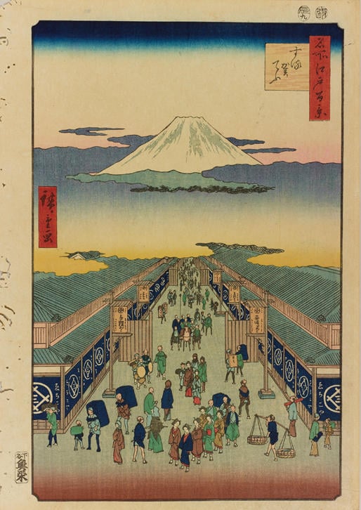そうですね。一番わかりやすいところですと、この歌川広重の浮世絵です。構図的にも全然リアルではないんですね。駿河町という、今の日本橋の少し北の三越百貨店のあたりから富士山を眺めているという景色です。真ん中のところにあるのが雲です。色も下のほうが黄色くて、上のほうが少し青色で、空は少し赤くなっている感じで不思議な色をしています。