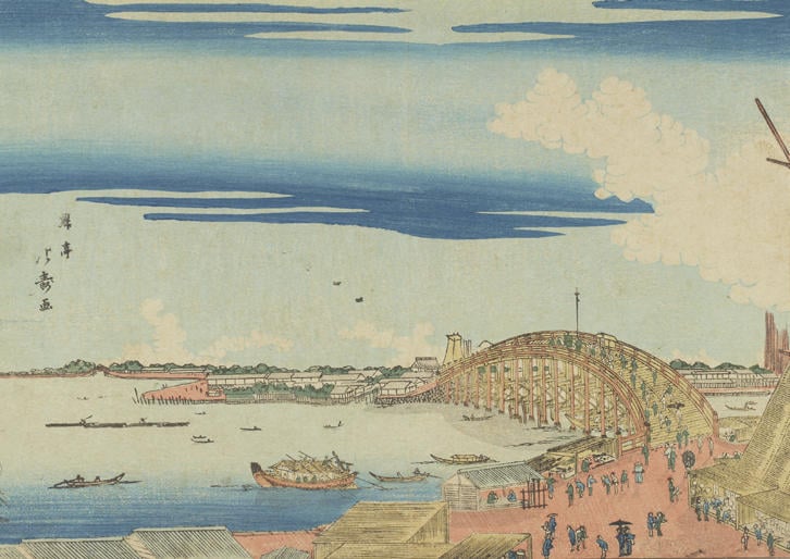 入道雲と言っていいのかわからないんですが、例えば、昇亭北寿という葛飾北斎の弟子が隅田川の両国橋を描いた絵ではもくもくとした雲が出ている描写がされていますね。これは19世紀のもので、西洋から銅版画が伝わっている時代なんですね。