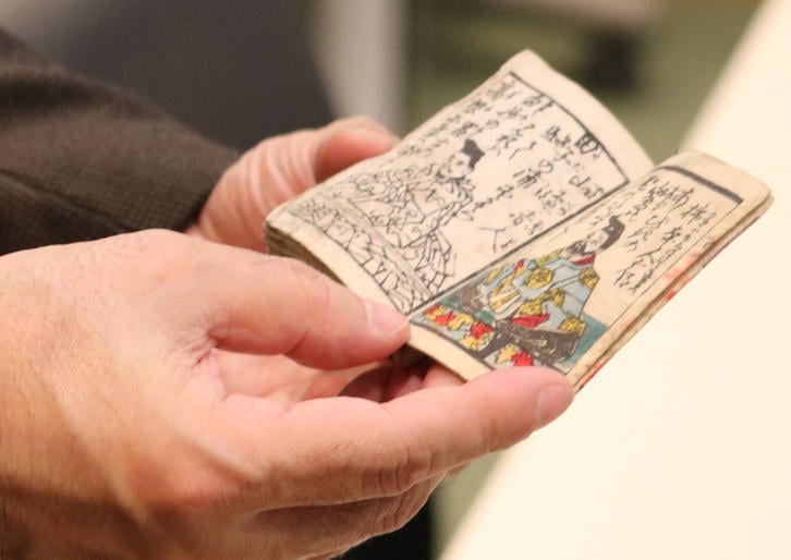 江戸時代には百人一首の本やかるたがどんどん作られていました。地方にもたくさん残っていますし、普及版みたいなかるたもたくさんあります。それから慶應義塾創立の頃に刊行されたこんな絵入の豆本もあります(写真)。