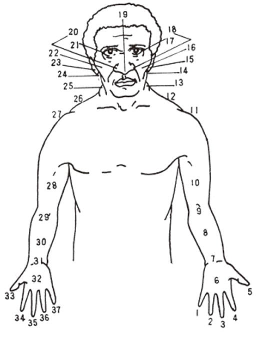 まず、「数えることの身体性」の話からいきたいと思います。下記の論文の図は、パプアニューギニアのある部族の、ものの数え方についての文化人類学の論文です。左手の小指から順に1、2、3、4、5、手のひらが6、手首が7、前腕部が8、肘が9、上腕部が10、肩が11、肩甲骨が12と、そうやって後、右に移って、37まで物の数を数える。このときには数という「概念」ではなくて「身体」に対応させて状況を把握する。これが一番原始的な数の数え方なんですね。
