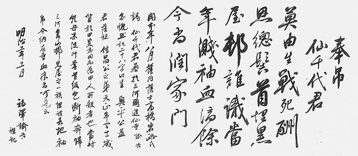 「奉弔仙千代君」という書幅があります。これは明治11年に福澤が本格的に書を始める前の作品です。これだけの書をちゃんと書けるところまで父や兄の書を見ながら練習していた。これは仙千代君(せんちよぎみ)という奥平家の先祖を悼む長文の作品ですが、謹厳実直というか整ったいい作品だと思うのですが。