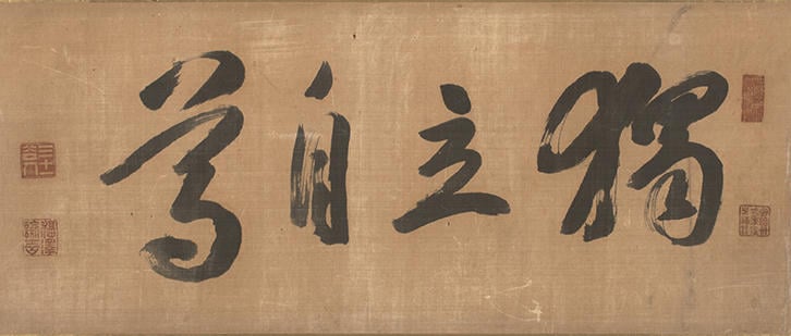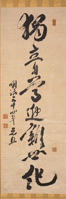 軸装書幅の「独立自尊迎新世紀」もいいと思いますよ。これはちょっと福澤諭吉にしては字間をたっぷり取ってあって。