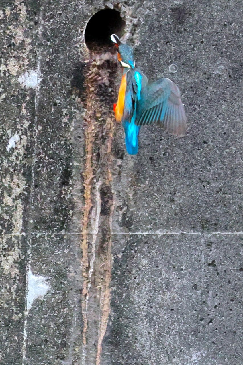 A川では高さ10メートルのコンクリート壁の水抜き穴の奥の巣に餌を運びに入っていきます。