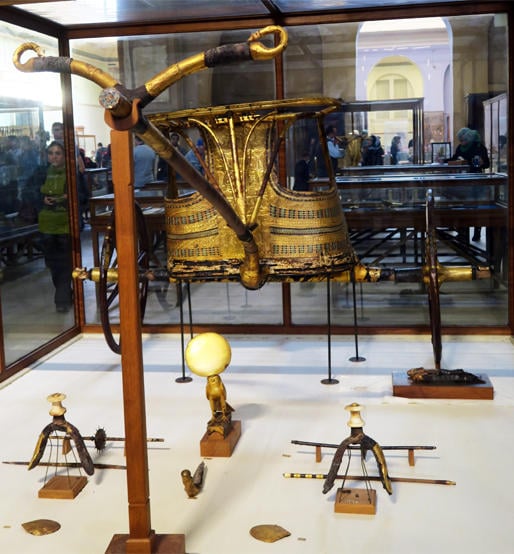 実はチャリオットとともに日よけが見つかっていたのですが、発掘したカーターはツタンカーメンがどこかで休憩するときに日よけとして使われていた物で、チャリオットとは関係ないと言っていました。