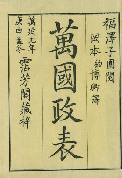 この『万国政表』の表紙には、「福澤子囲閲 岡本約博卿譯」と書かれている。「子囲(しい)」は福澤の字(あざな)であり、「約」は岡本の実名、「博卿」は字である。すなわち、この本は岡本が翻訳をし、福澤が監修した本ということになる。その経緯については、『万国政表』の凡例の中で岡本が次のように述べている。