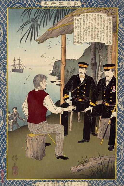 さて、ここまでの田中の半生を世に紹介したのは時事新報である。明治19(1886)年1月15日から2月12日まで、「東洋の小ロビンソンクルーソー」という題名で連載された。連載までの経緯は次の通りである。明治18年12月、軍艦・日進艦が小笠原に寄港し、田中に出会った軍人たちはその高志に感銘を受けた。東京に戻り、田中の話を世に紹介したいと考えた大尉が時事新報に概要を寄稿し、記者が連載の形に仕立てたのである。